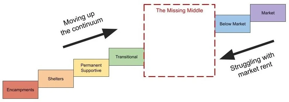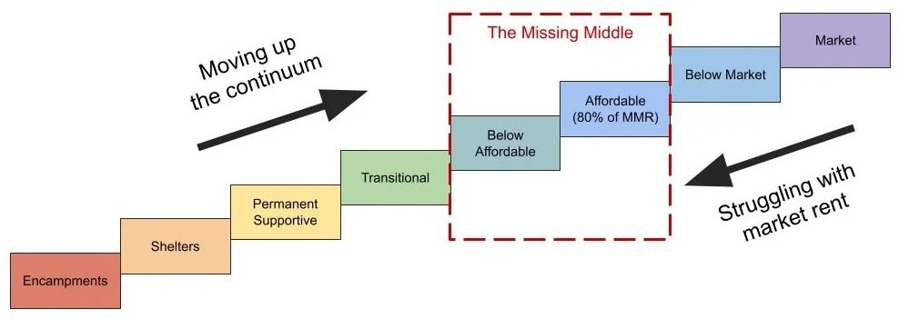 Providing missing middle housing (below affordable and affordable) not only creates the necessary steps in the continuum, it also unlocks the shelter and deeply affordable end of the continuum to do what it does best: provide shelter for people in emergencies or in need of permanent or transitional supports.